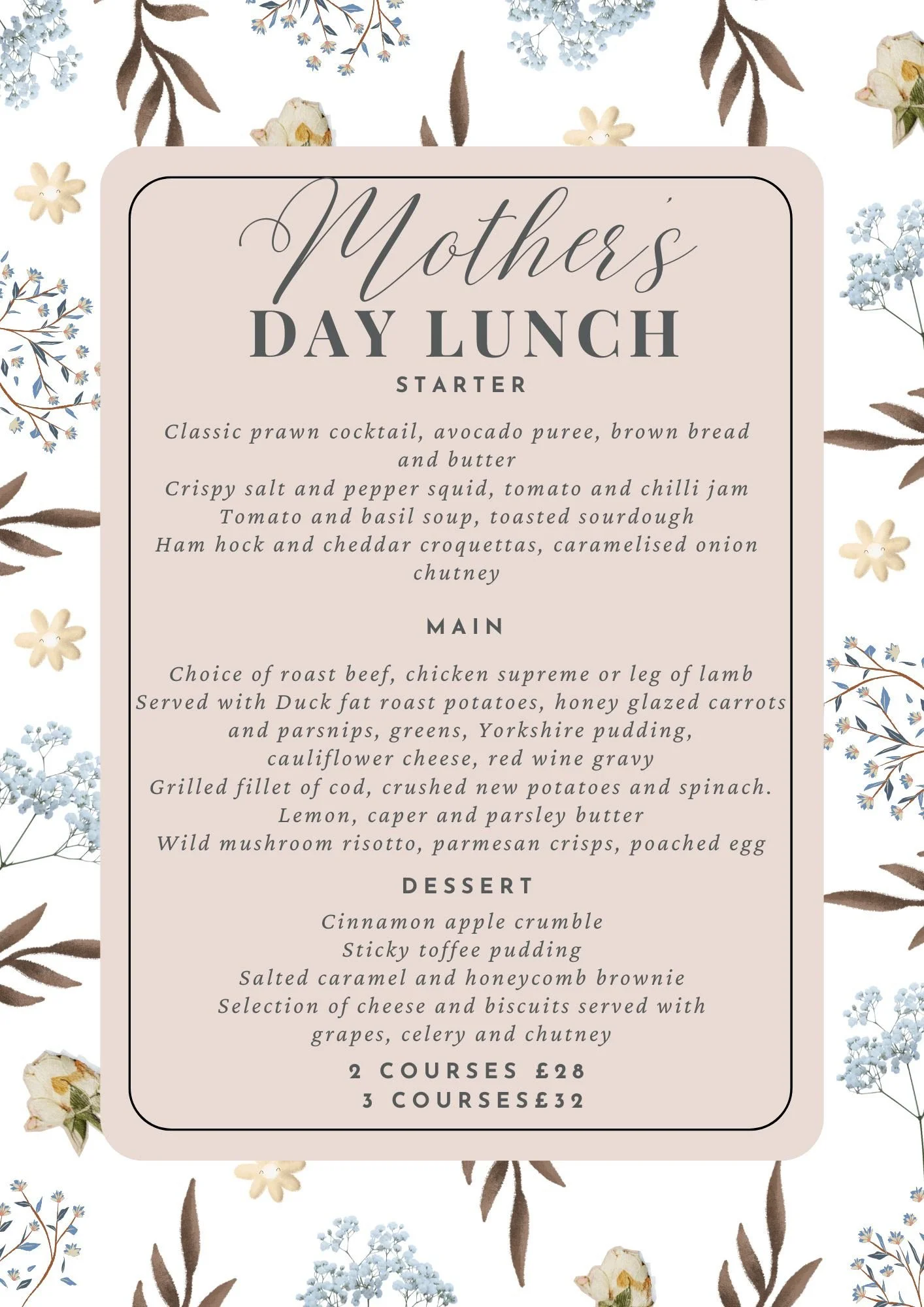 Treat your Mother to a delicious lunch at the club, Menu below. Limited spaces left. Please book asap by calling the bar on 07803 098585.